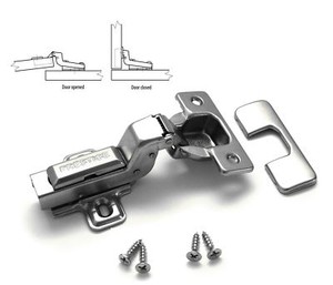 Prestige Kitchen Cabinet Hinges. Builders Line Compact Hinge - 12 inch Overlay Screw-On - Soft-Close - 4 Way 2 Cam Adjustable - Face-Frame by The Builder Economy Line. Applications where Prestige Products are used. Compact Blumotion 38N Hinge and Plate 12 inch Overlay Screw On by Blum.